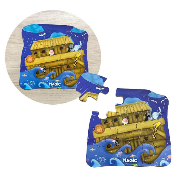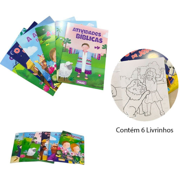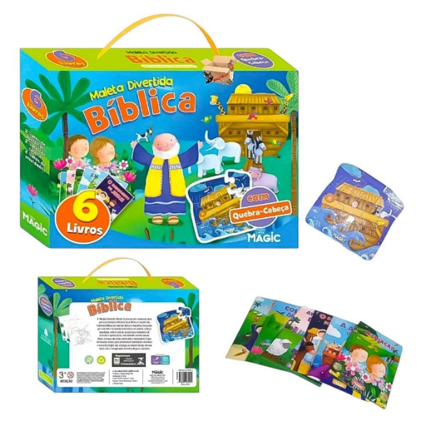 A Maleta divertida bíblica com 6 livros infantis e 1 quebra-cabeça é ideal para ensinar histórias da Bíblia de forma lúdica, desenvolvendo a leitura, memória e valores cristãos nas crianças.